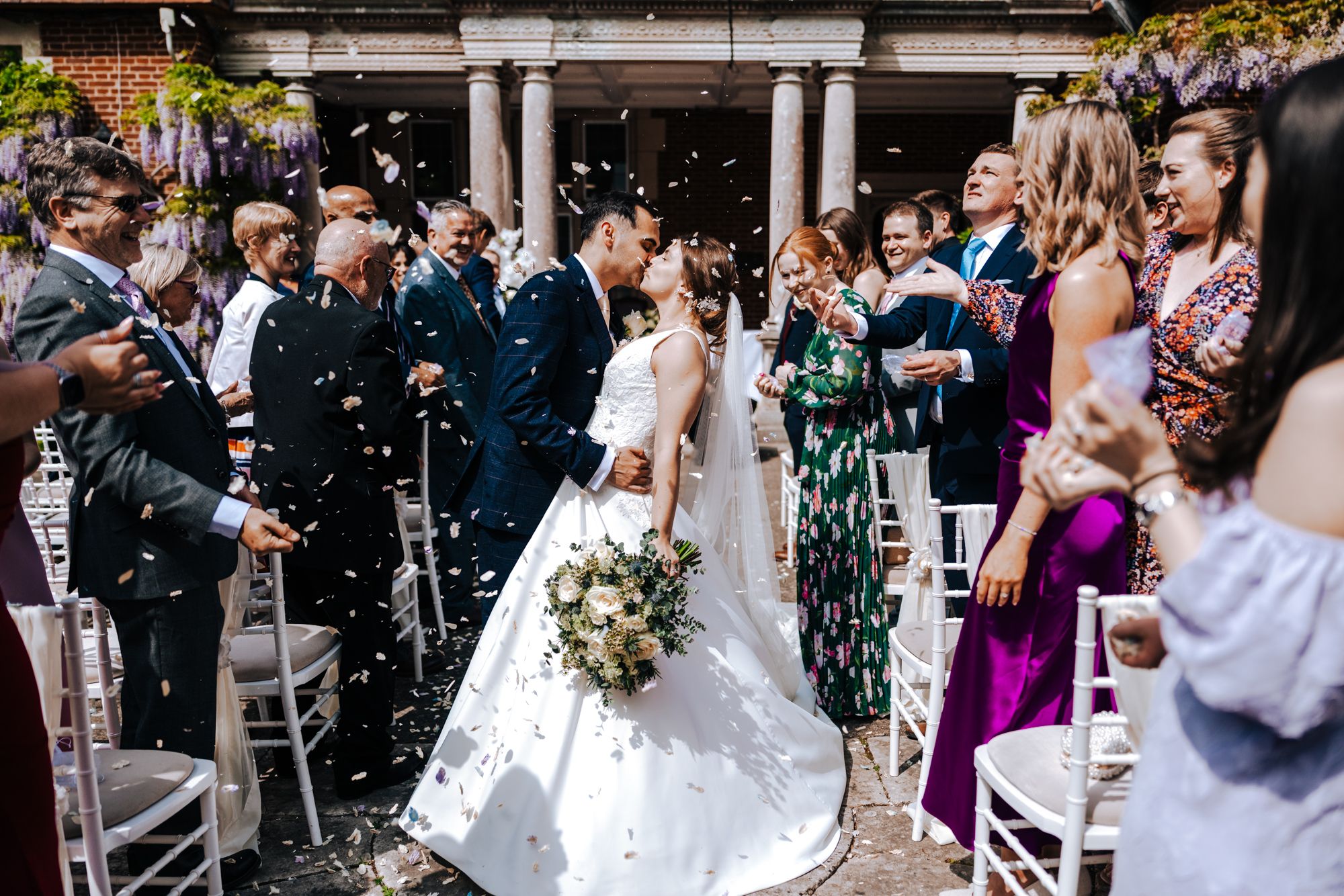 Confetti works best just outside the ceremony area or near the terrace. I keep this simple and quick so guests can head straight back to their drinks.