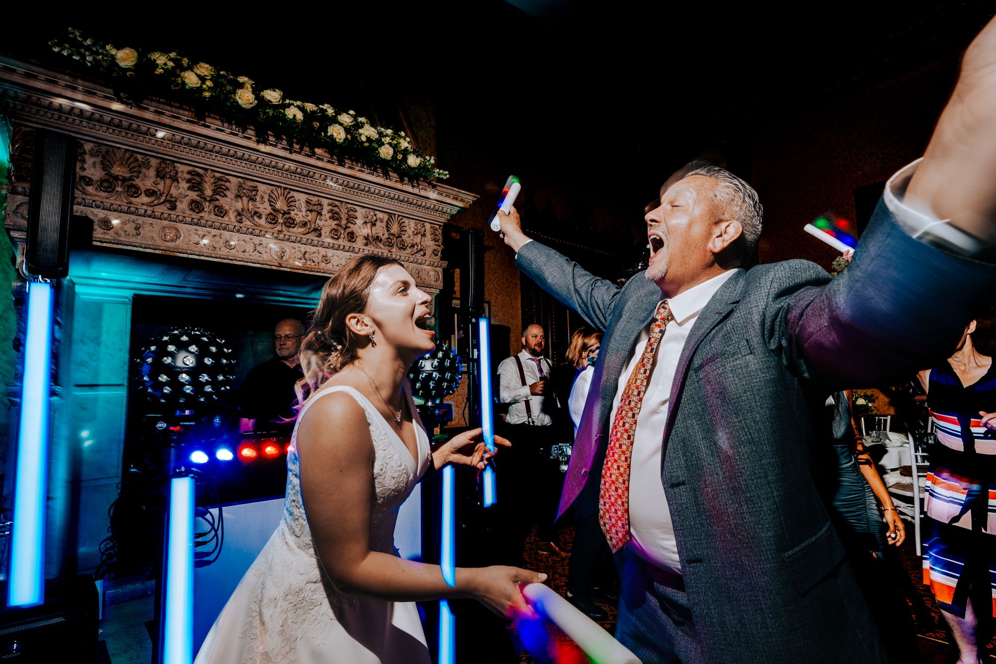 As the evening begins, the atmosphere shifts. The lights come down, the music starts and the day becomes more energetic. I stay close to the action, photographing the first dance, the dance floor and the moments in between.