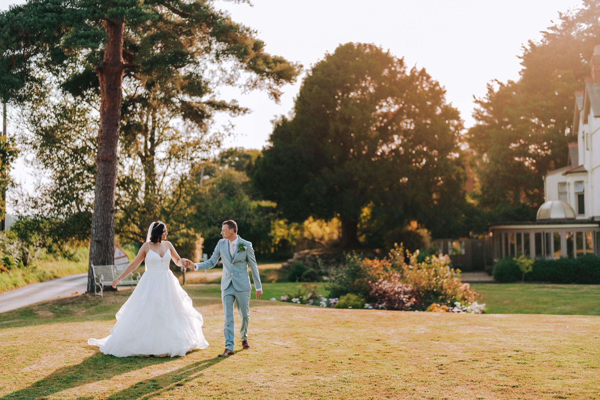 The garden ceremony space at Southdowns Manor sits at the back of the house, surrounded by mature trees and landscaped lawns. The pergola provides a licensed outdoor setting for your vows, and the open space gives you clean lines, soft light, and plenty of room for guests. It works well for wide ceremony shots, close moments between the two of you, and natural reactions from your family and friends. This area also lets you move straight into relaxed portraits without needing to leave your guests.