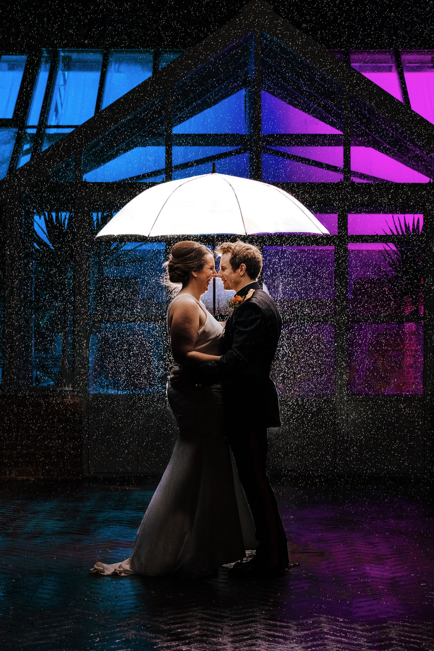 As night fell, the rain gave us the perfect backdrop for one of my favourite shots of the day. Standing in front of the glasshouse, illuminated by soft lighting, Claire and James embraced as the rain fell around them. It was a magical, cinematic moment—one that perfectly capped off their incredible day.